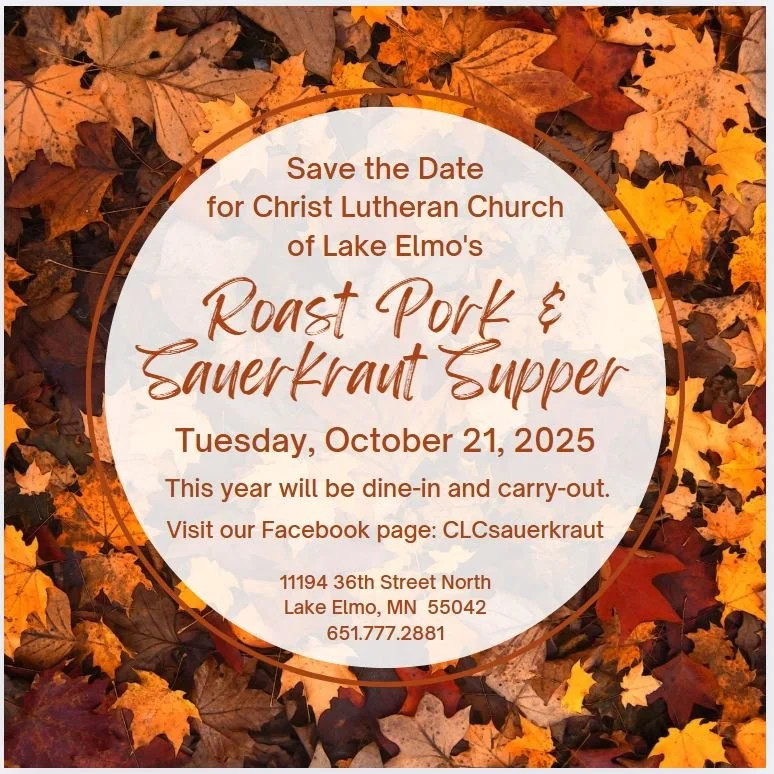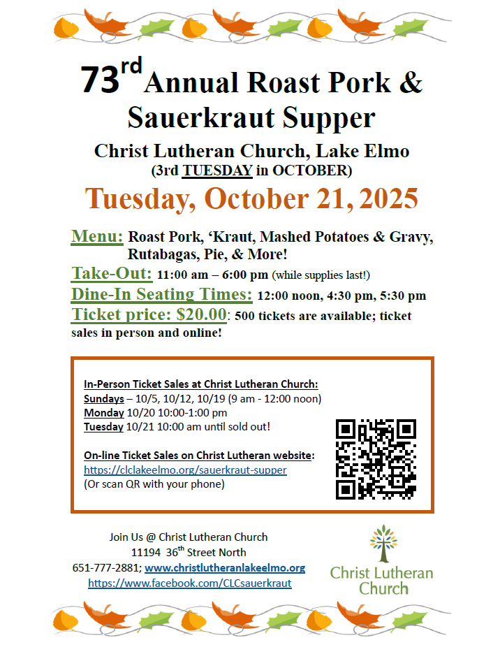 Join us for our 73rd annual Roast Pork and Sauerkraut Supper. Held at Christ Lutheran Church in Lake Elmo we serve a menu of the following: